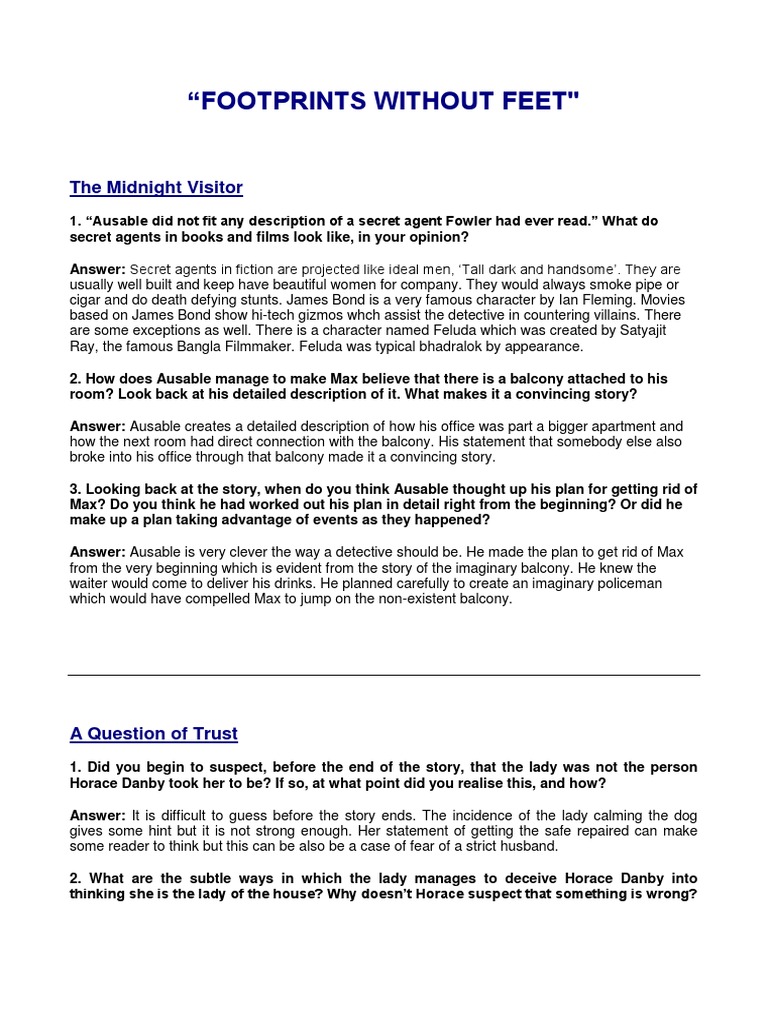 Footprints without Feet Summary Class 10 English - Learn CBSE. At the end of each chapter, there are various questions categorised into think about it and talk about it. Class 10 english chapter wise ncert solution for english part 1 and english part 2 for all the chapters can be downloaded from our website and mycbseguide mobile footprints. 4 a question of trust. (download) ncert book for class x : 1 a triumph of surgery. Footprints without feet in the lesson is telugu.